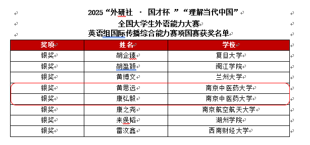 近日,2025“外研社·国才杯”“理解当代中国”全国大学生外语能力大赛全国总决赛圆满落幕。我校2022级中西医结合临床医学专业学生黄思远、2022级公共事业管理(中外合作办学)专业学生康弘毅凭借扎实的英语语言功底、深厚的知识储备与稳定的临场发挥,在英语组国际传播综合能力赛项中脱颖而出,荣获全国总决赛银奖。至此,我校已连续两年在该项赛事全国总决赛中斩获银奖。